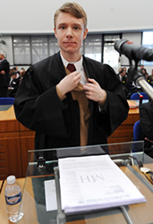 Am 18.3.2009 fand vor der Großen Kammer des EGMR zu Straßburg die mündliche Verhandlung in Sachen Gäfgen v Germany statt. Unter http://www.echr.coe.int/ECHR/EN/Header/Press/Multimedia/Webcasts+of+public+hearings/ ist im Webcast des Gerichtshofs die Verhandlung mit den Plädoyers beider Seiten in voller Länge in deutscher Originalfassung oder in englischer bzw. französischer Simultanübersetzung abrufbar. Der Text des Plädoyers von Herrn RA Dr. Heuchemer für den Beschwerdeführer ist hier zugänglich. Auf der Bank der Prozessbevollmächtigen des Beschwerdeführers sind neben Herrn RA Dr. Heuchemer unser Kooperationspartner Herr RA Dirk Schmitz M.A. und links neben ihm Herr RA und Syndicus Dr. v. Becker zu sehen; hinter ihm die beiden Wiss. Mit. Stefan Ströhm und Max Bolsinger. Die Gerichtsbesetzung der durch siebzehn Richter und vier Ergänzungsrichter besetzten Großen Kammer und die Prozessvertretung des Beschwerdeführers bzw. der Regierung der Bundesrepublik Deutschland waren an diesem Tage wie folgt: ECHR Public Hearing